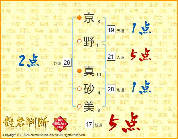 京(8画)野(11画) 真(10画)砂(9画)美(9画)