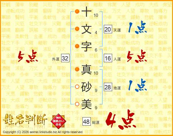 生活面を象徴する運勢です。外部から受ける影響力を表し、結婚運、家庭運や職場、環境への順応性を表します。総運から人運を引いた画数。姓や名が1文字の場合を除く。