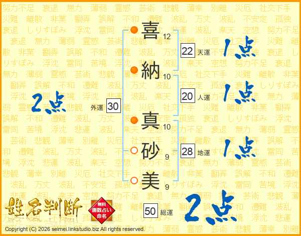 喜(12画)納(10画) 真(10画)砂(9画)美(9画)