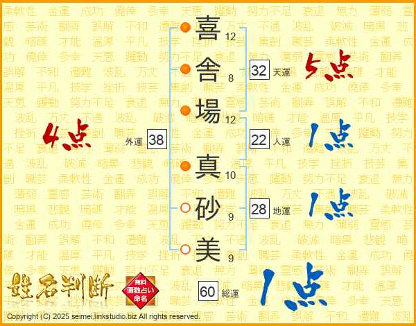 喜(12画)舎(8画)場(12画) 真(10画)砂(9画)美(9画)