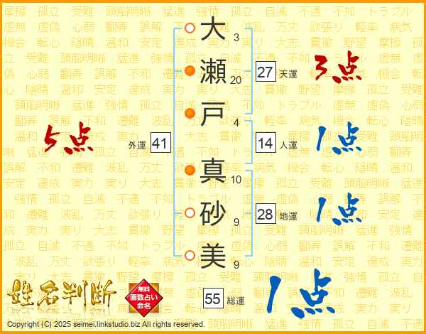 大(3画)瀬(20画)戸(4画) 真(10画)砂(9画)美(9画)