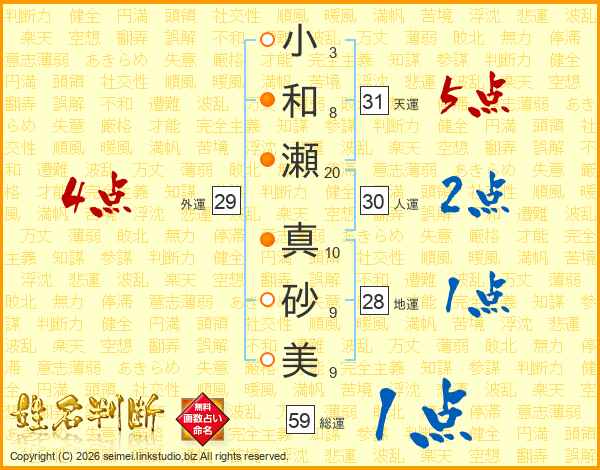 小(3画)和(8画)瀬(20画) 真(10画)砂(9画)美(9画)