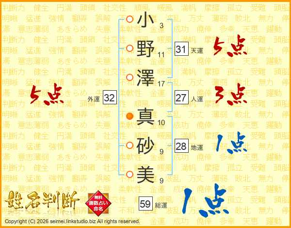 小野澤真砂美さんの天運は31画の5点!
