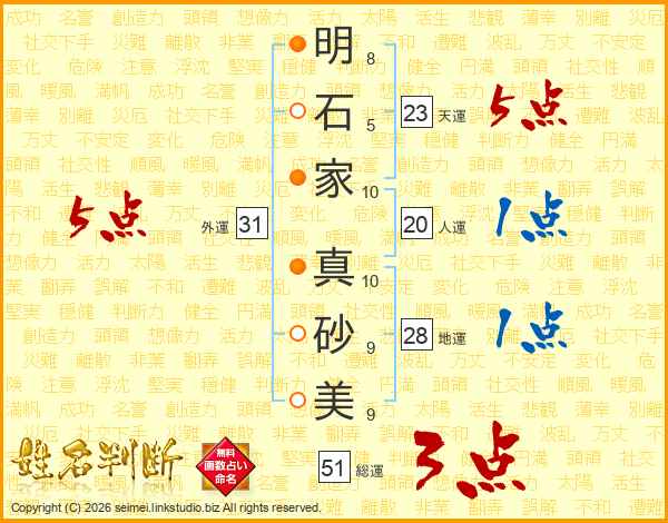 明(8画)石(5画)家(10画) 真(10画)砂(9画)美(9画)