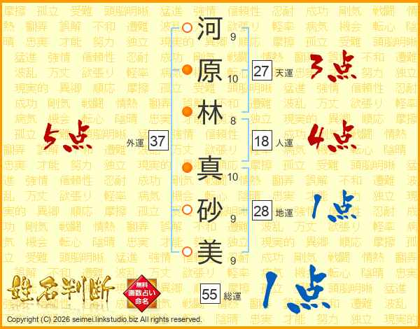 河(9画)原(10画)林(8画) 真(10画)砂(9画)美(9画)