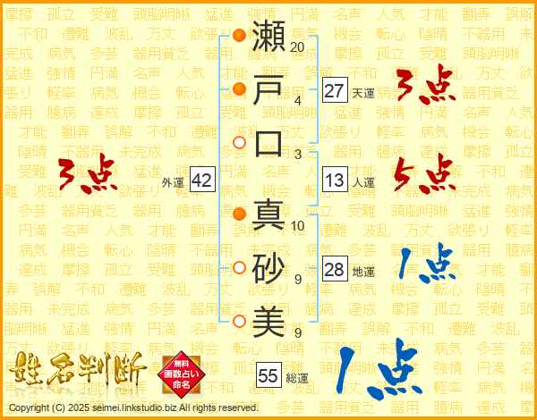瀬戸口真砂美さんの人運は13画の5点!