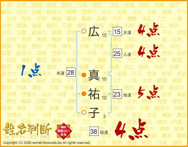 生活面を象徴する運勢です。外部から受ける影響力を表し、結婚運、家庭運や職場、環境への順応性を表します。総運から人運を引いた画数。姓や名が1文字の場合を除く。