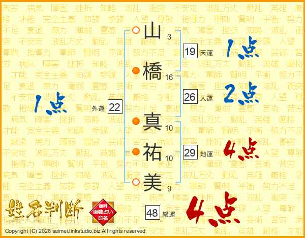 山(3画)橋(16画) 真(10画)祐(10画)美(9画)