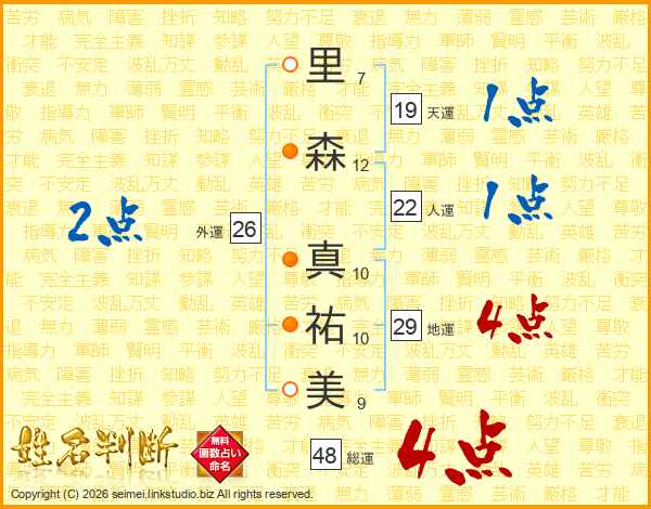 里(7画)森(12画) 真(10画)祐(10画)美(9画)