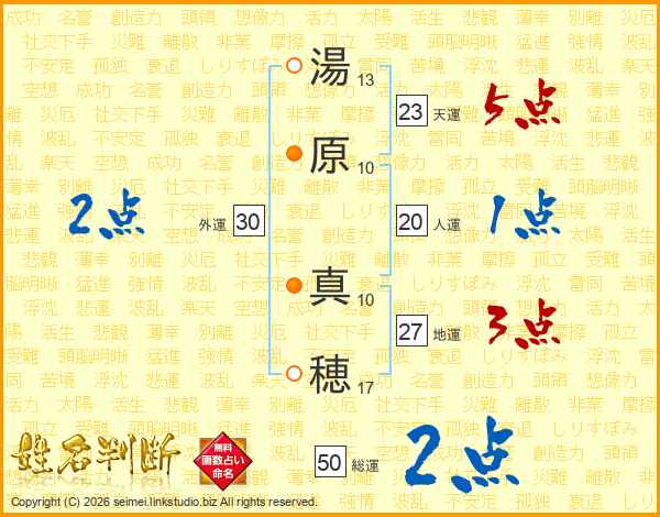 生活面を象徴する運勢です。外部から受ける影響力を表し、結婚運、家庭運や職場、環境への順応性を表します。総運から人運を引いた画数。姓や名が1文字の場合を除く。