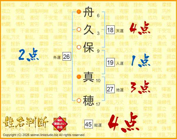 舟(6画)久(3画)保(9画) 真(10画)穂(17画)