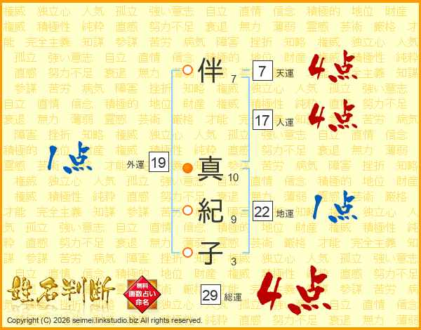 伴(7画) 真(10画)紀(9画)子(3画)