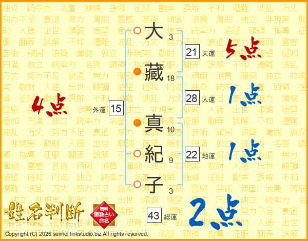 大(3画)藏(18画) 真(10画)紀(9画)子(3画)