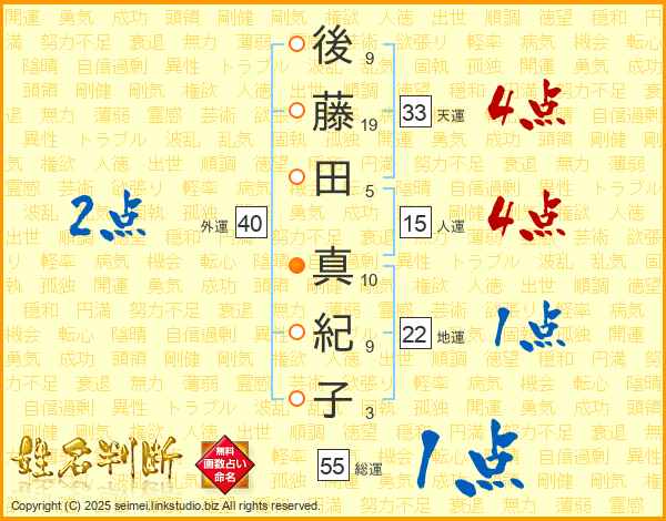 後(9画)藤(19画)田(5画) 真(10画)紀(9画)子(3画)