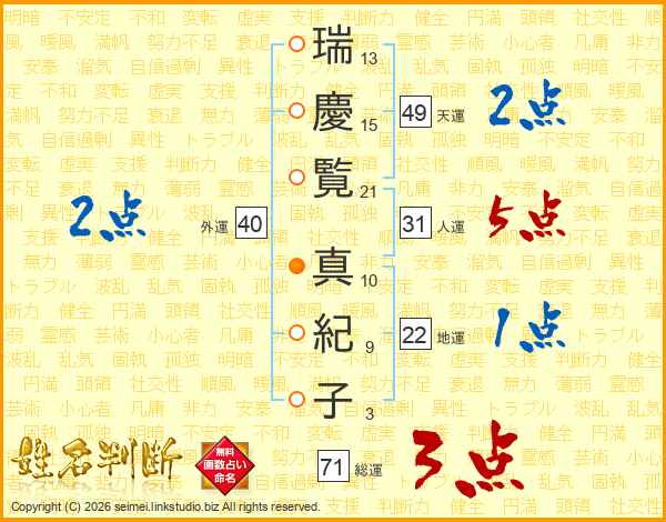 瑞(13画)慶(15画)覧(21画) 真(10画)紀(9画)子(3画)