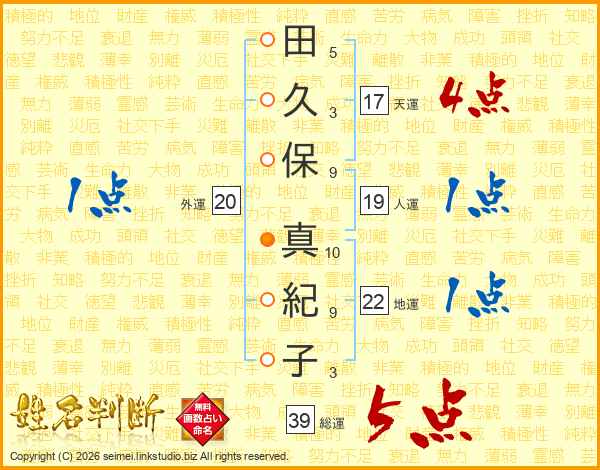 田久保真紀子さんの総運は39画の5点!