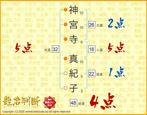 神(10画)宮(10画)寺(6画) 真(10画)紀(9画)子(3画)