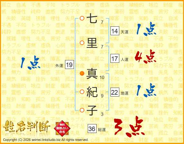 七(7画)里(7画) 真(10画)紀(9画)子(3画)