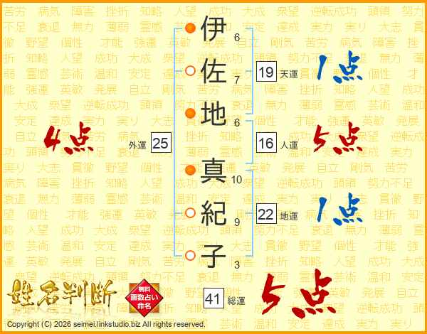 伊(6画)佐(7画)地(6画) 真(10画)紀(9画)子(3画)