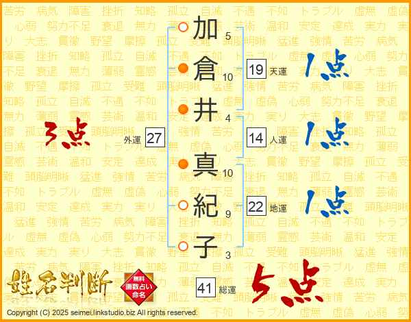 加(5画)倉(10画)井(4画) 真(10画)紀(9画)子(3画)