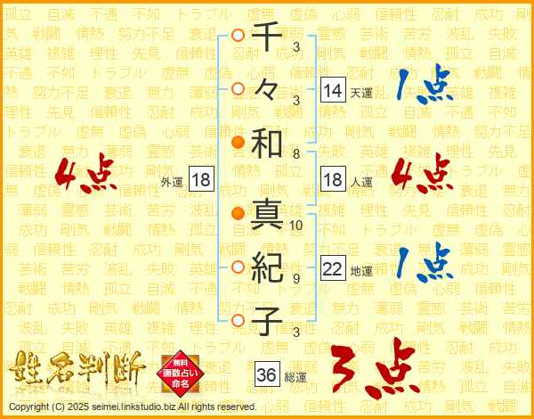 千(3画)々(3画)和(8画) 真(10画)紀(9画)子(3画)