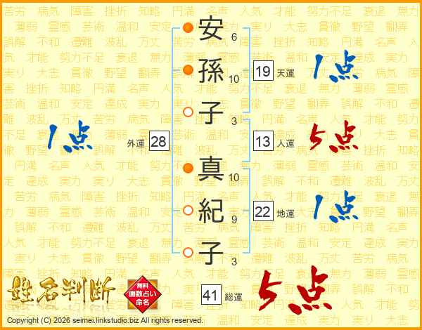 安(6画)孫(10画)子(3画) 真(10画)紀(9画)子(3画)