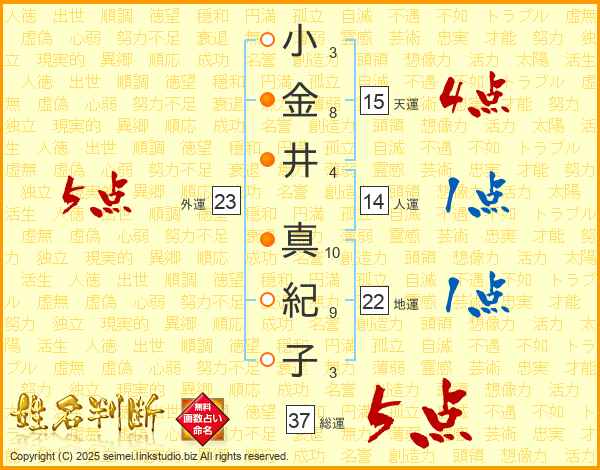 小金井真紀子さんの総運は37画の5点!
