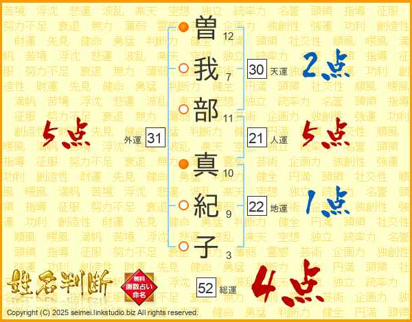 曽(12画)我(7画)部(11画) 真(10画)紀(9画)子(3画)