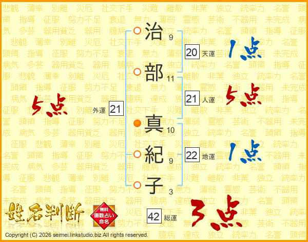 治(9画)部(11画) 真(10画)紀(9画)子(3画)