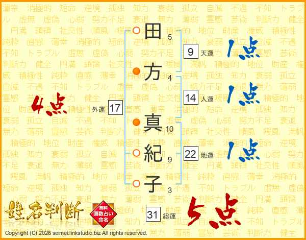 田(5画)方(4画) 真(10画)紀(9画)子(3画)