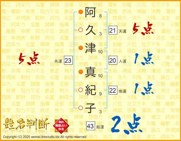 阿(8画)久(3画)津(10画) 真(10画)紀(9画)子(3画)
