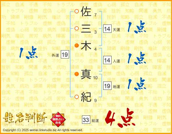 佐(7画)三(3画)木(4画) 真(10画)紀(9画)
