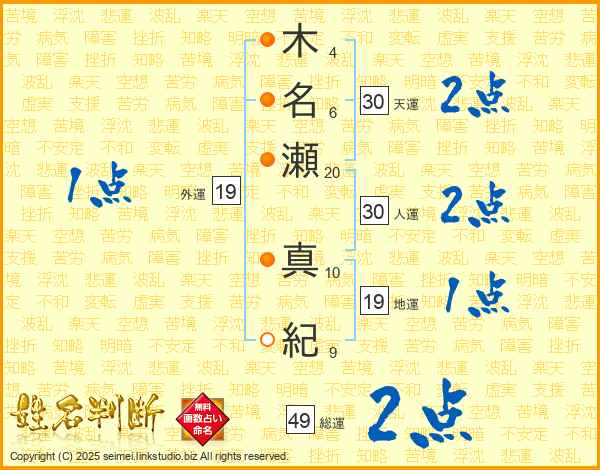 木(4画)名(6画)瀬(20画) 真(10画)紀(9画)