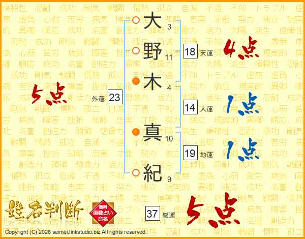 大野木真紀さんの総運は37画の5点!