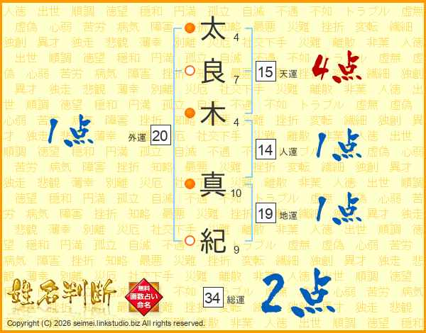 太(4画)良(7画)木(4画) 真(10画)紀(9画)