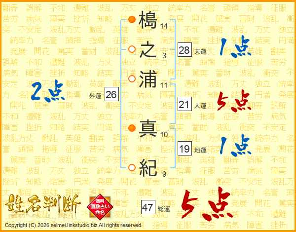 槝(14画)之(3画)浦(11画) 真(10画)紀(9画)