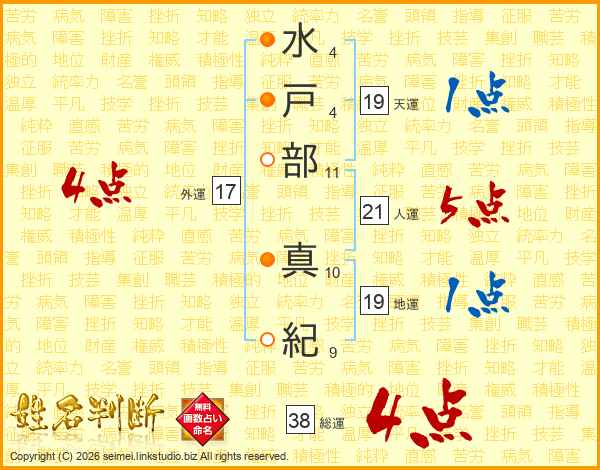 水(4画)戸(4画)部(11画) 真(10画)紀(9画)