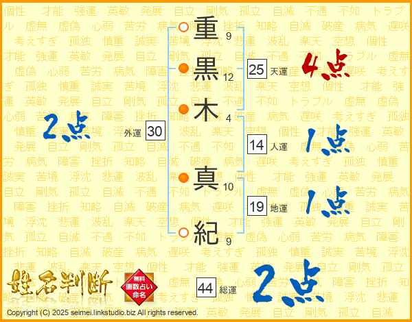 重(9画)黒(12画)木(4画) 真(10画)紀(9画)