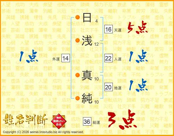 あなたの人生を表す1番重要な運勢です。生涯を通じて影響する総合運となり、主に50歳以降の晩年期に影響を及ぼします。苗字と名前の合計画数。