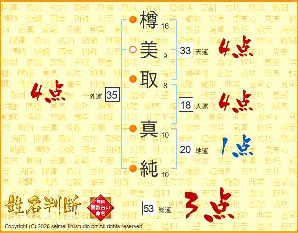 樽(16画)美(9画)取(8画) 真(10画)純(10画)