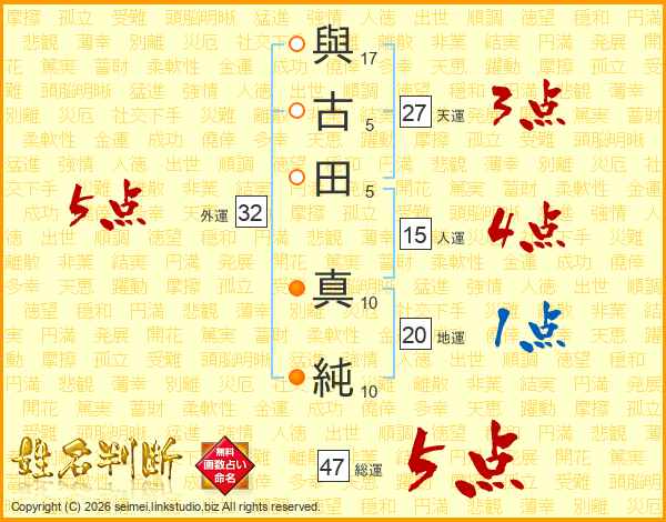 與(17画)古(5画)田(5画) 真(10画)純(10画)