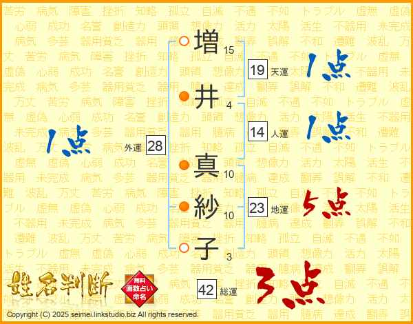 増(15画)井(4画) 真(10画)紗(10画)子(3画)