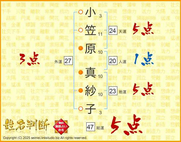 小(3画)笠(11画)原(10画) 真(10画)紗(10画)子(3画)