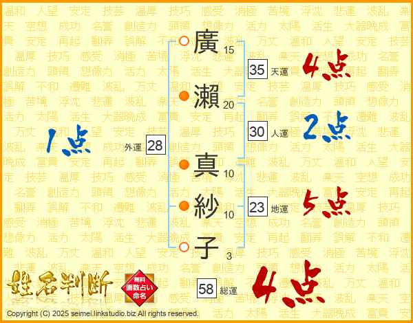 廣(15画)瀨(20画) 真(10画)紗(10画)子(3画)