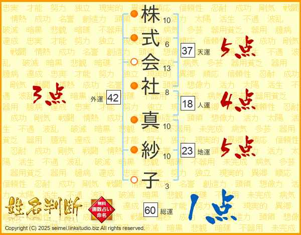 株(10画)式(6画)会(13画)社(8画) 真(10画)紗(10画)子(3画)