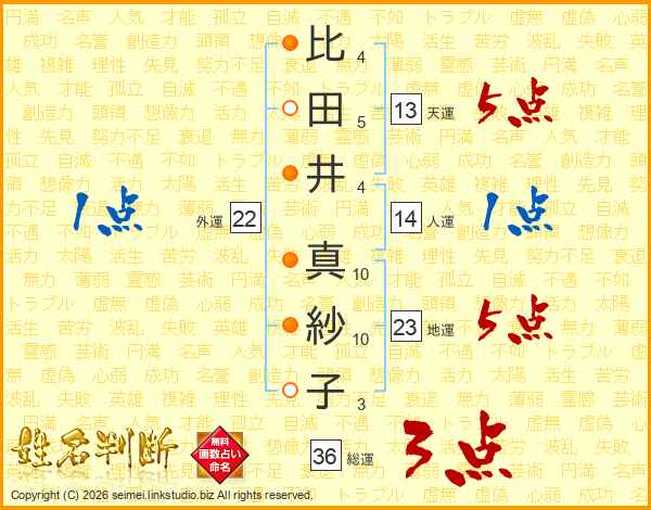比(4画)田(5画)井(4画) 真(10画)紗(10画)子(3画)