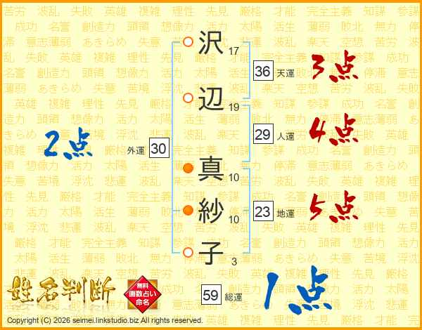 沢(17画)辺(19画) 真(10画)紗(10画)子(3画)