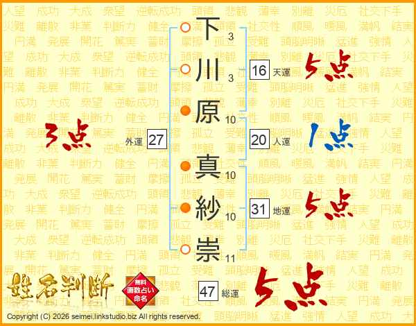 下川原真紗崇さんの総運は47画の5点!