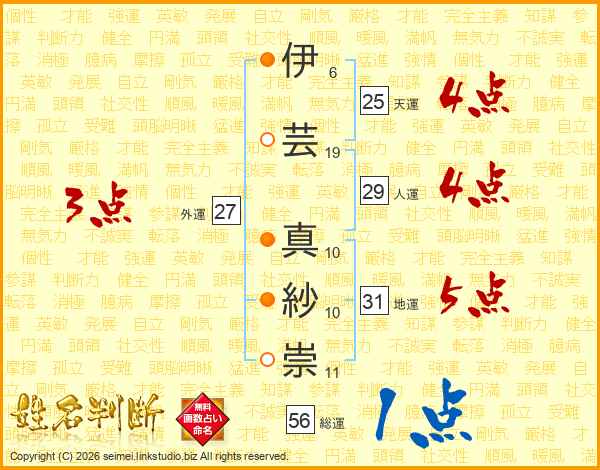 伊(6画)芸(19画) 真(10画)紗(10画)崇(11画)