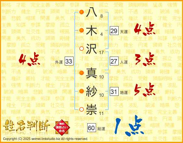 八木沢真紗崇さんの天運は29画の4点!